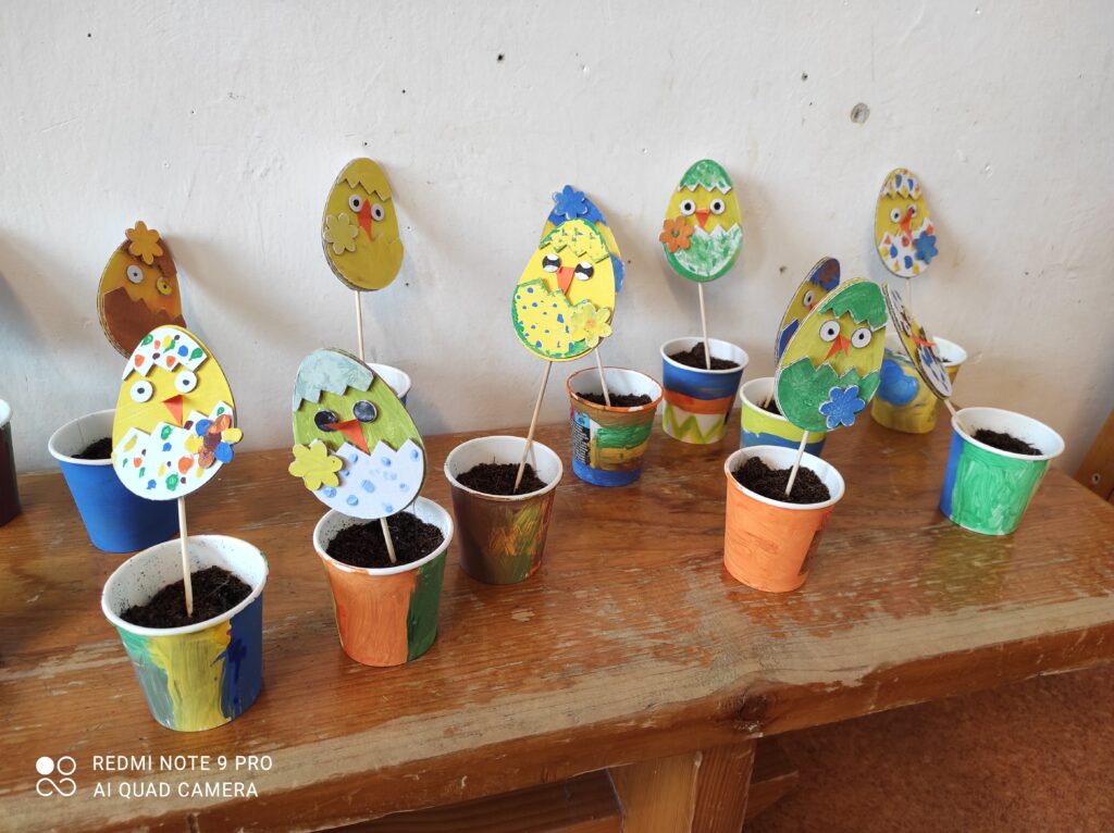 Kromě hlíny a semínek přišly na řadu i nůžky, papíry a lepidla. Děti vyráběly veselé velikonoční zápichy do květináčů, papírové kytičky a velikoční věnce. Kreativita dětí neznala mezí a vznikla tak spousta krásných dekorací, které si děti odnesly domů.